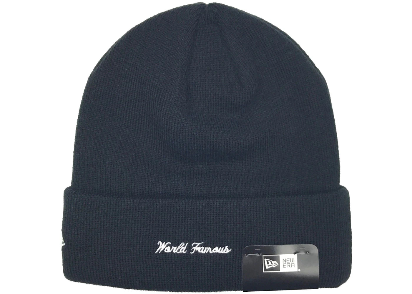 The Supreme New Era Box Logo Beanie Black FW17 features a black polyester construction with dual-branded details. It includes a yellow Supreme box logo on the front, a New Era side logo, and "World Famous" embroidery on the back. Inner logo tags complete the design.
