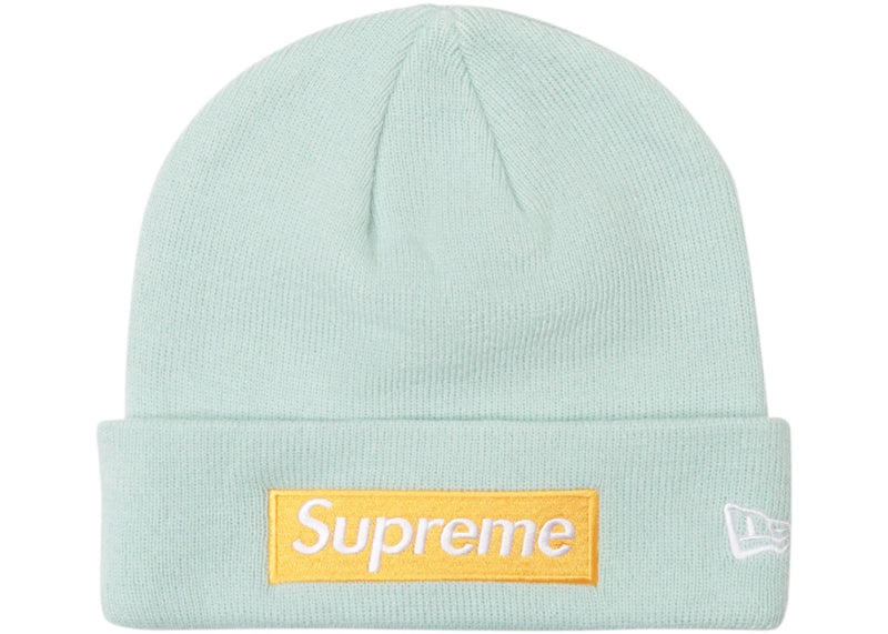 The Supreme New Era Box Logo Beanie Ice Blue FW17 features a fold-over cuff and a New Era logo on the side. Made from acrylic, it provides warmth and comfort in cold weather. The ice blue colorway offers a distinctive take on the classic box logo design. Released on December 14, 2017, the Supreme New Era Box Logo Beanie Ice Blue FW17 is available now at Side Kicks.