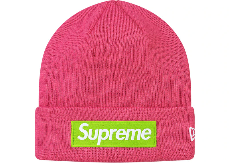 The Supreme New Era Box Logo Beanie Magenta FW17 features an embroidered box logo on the front and a New Era logo on the side. Made from 100% acrylic, the...