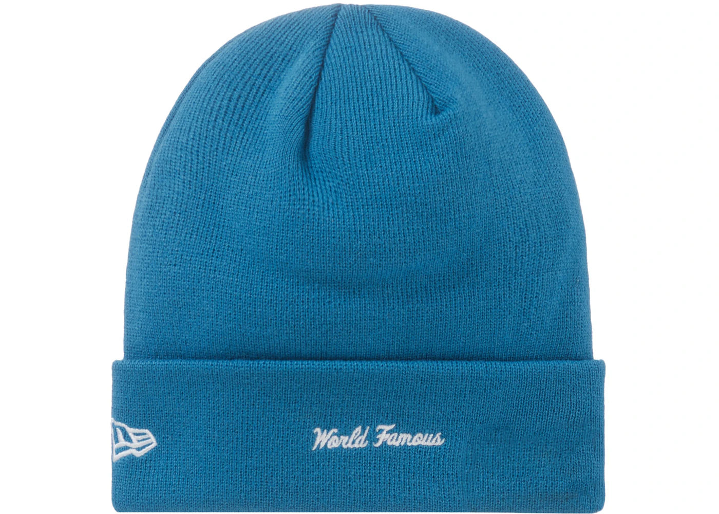 The Blue Supreme New Era Box Logo Beanie (FW22) features a soft acrylic knit construction for warmth and comfort. It comes in a vibrant blue hue with the iconic Supreme box logo on the cuff and "World Famous" embroidery on the back. Designed in collaboration with New Era, it merges streetwear style with quality craftsmanship.