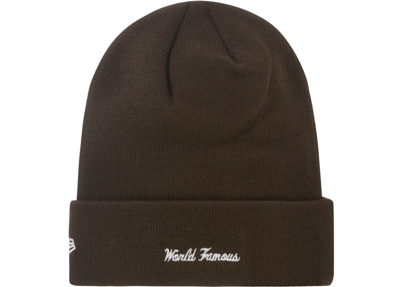 The Supreme New Era Box Logo Beanie (FW22) Brown features an acrylic construction with a foldable cuff for a snug fit. The brown beanie showcases an embroidered red and white Supreme box logo on the front, complemented by New Era branding on the side. The back displays the "World famous" inscription in calligraphic style. Released on December 8, 2022, the Supreme New Era Box Logo Beanie (FW22) Brown is available now at Side Kicks.