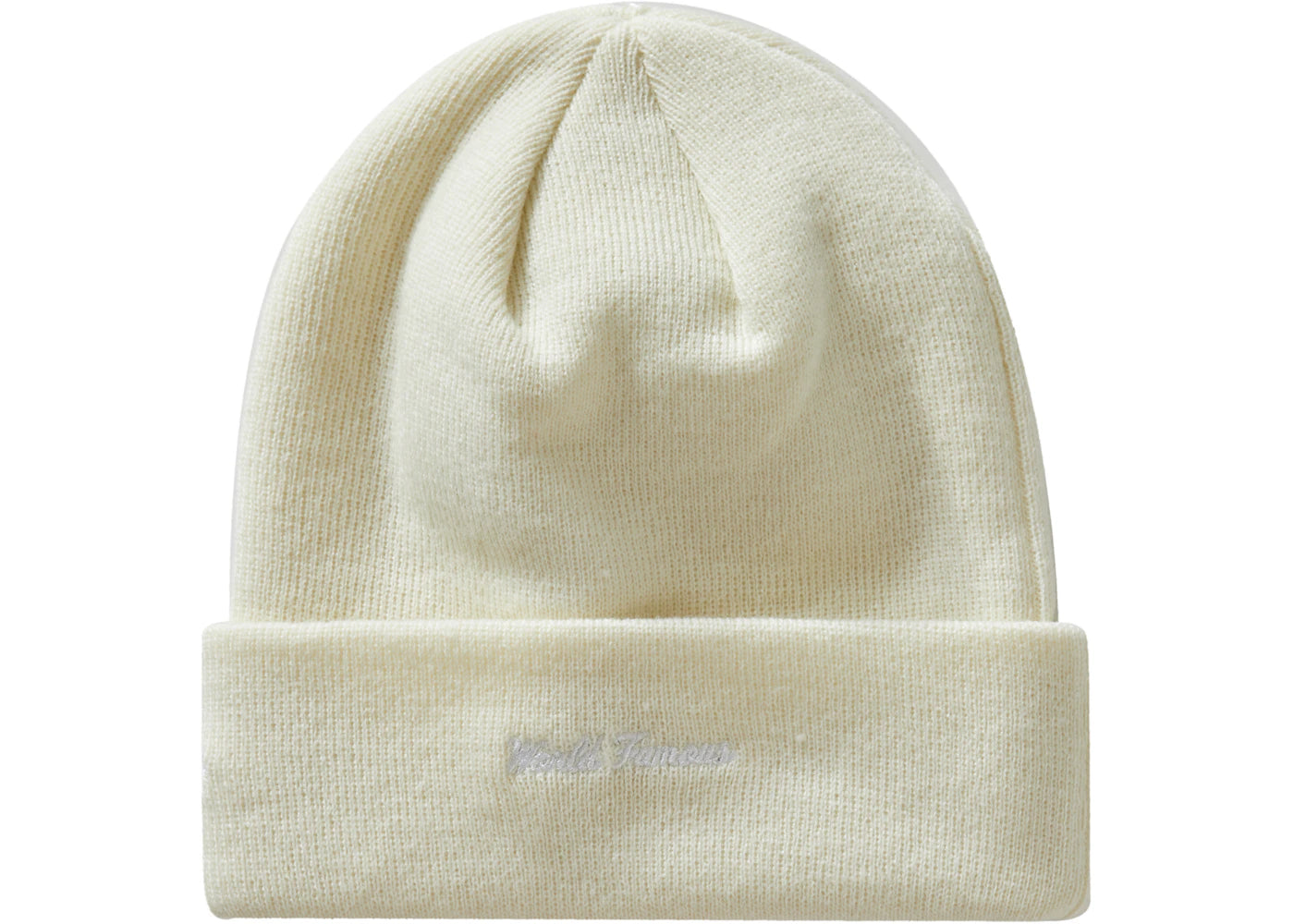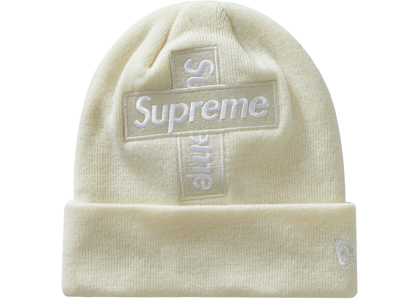 The Supreme New Era Cross Box Logo Beanie Natural features durable acrylic fabric with a ribbed knit finish for a comfortable fit. The front displays an embroidered Cross Box logo...
