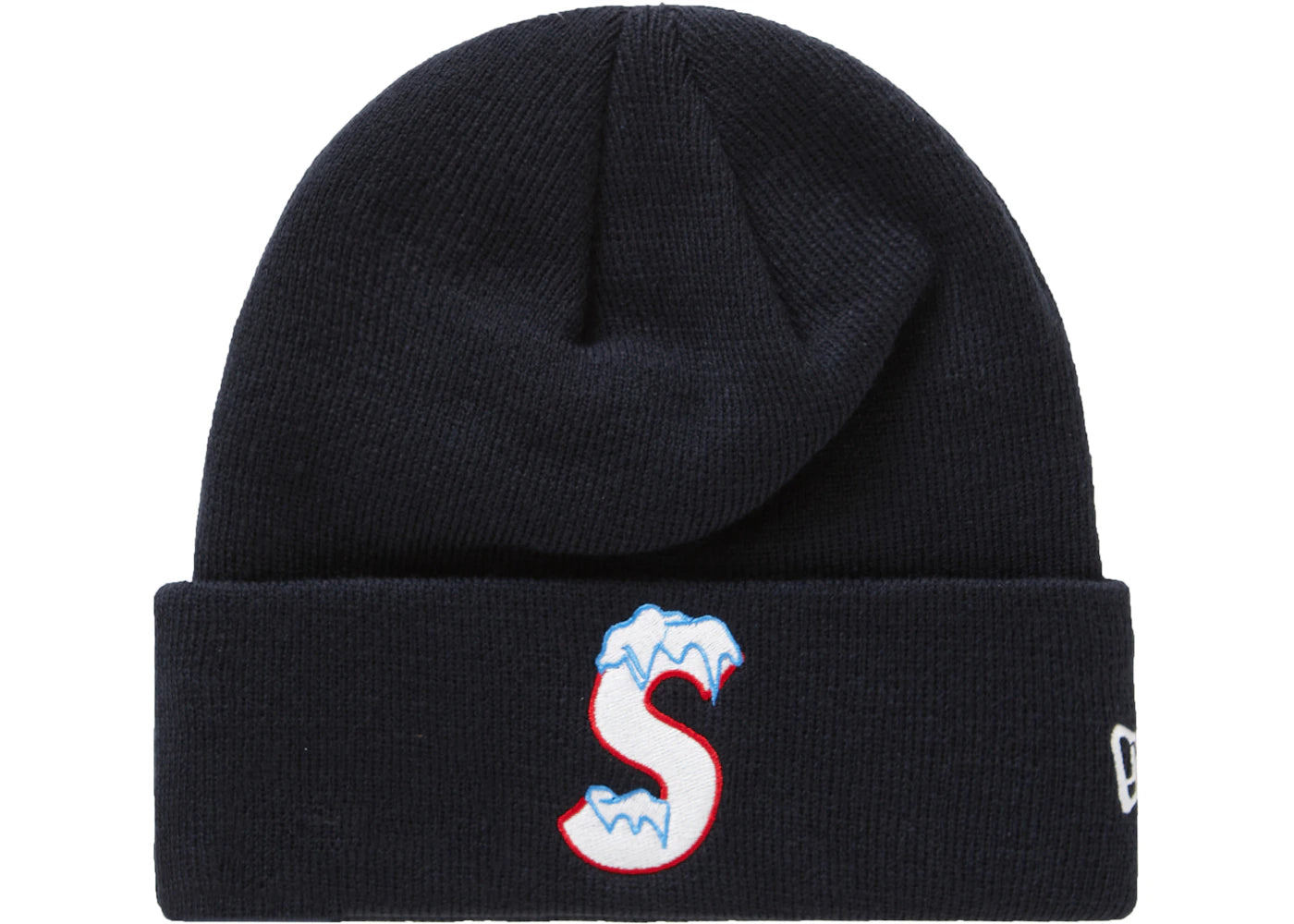 The Supreme New Era Cross Box Logo Beanie Navy features a dark navy design with overlapping box logos forming a cross on the crown. The cuff includes embroidered New Era...