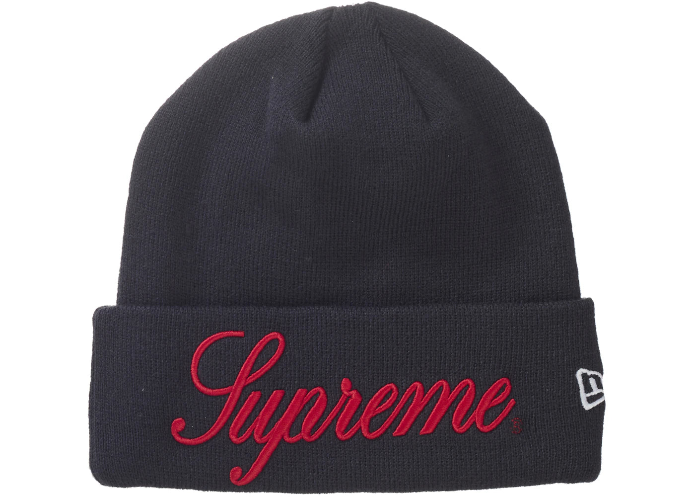 The Supreme New Era Script Beanie Navy is now available at Side Kicks!