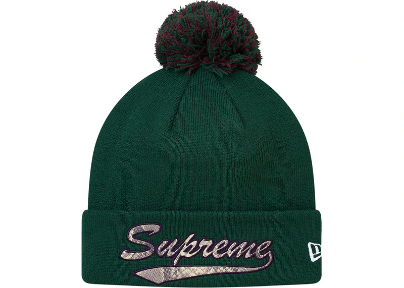 The Supreme New Era Snake Script Beanie Dark Green is now available at Side Kicks!