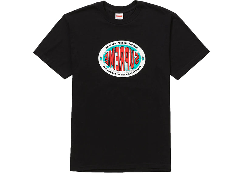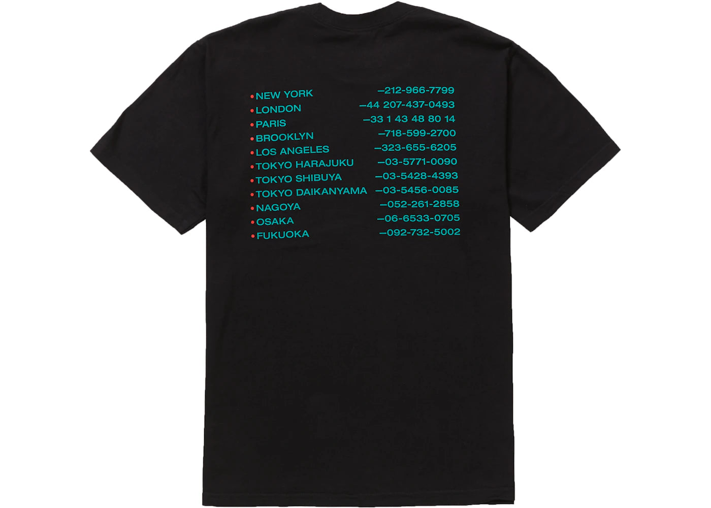 The Supreme New Shit tee features a reversed "New Shit From Supreme Authorized Dealer" graphic on the front and a list of store locations with phone numbers on the back....