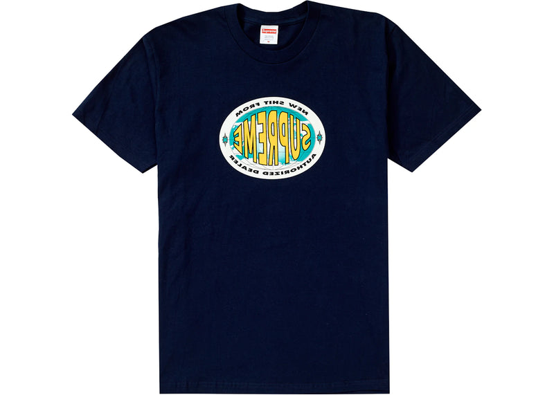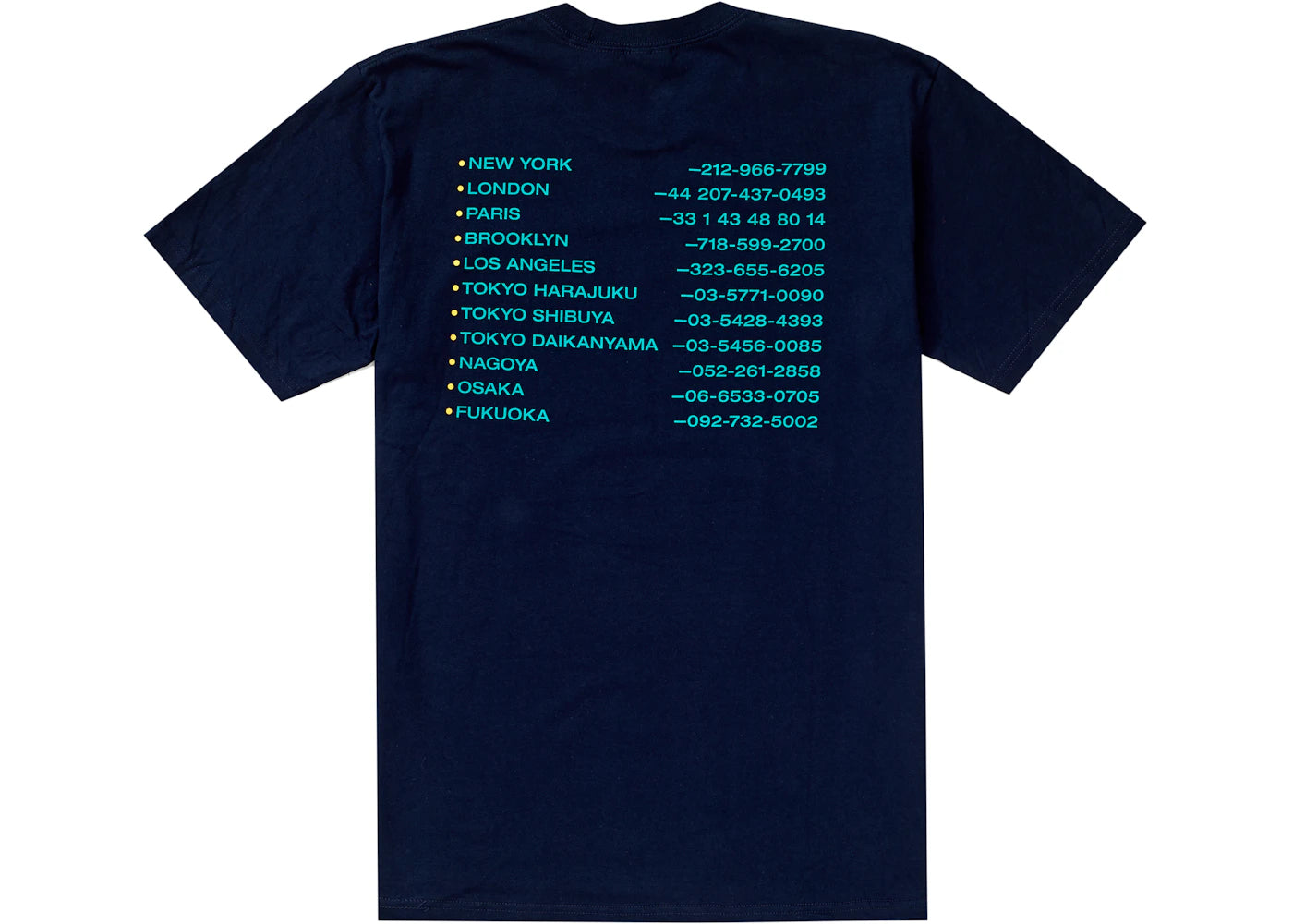 The Supreme New Shit tee features a reversed "New Shit From Supreme Authorized Dealer" graphic on the front and lists store locations with phone numbers on the back. Released on...
