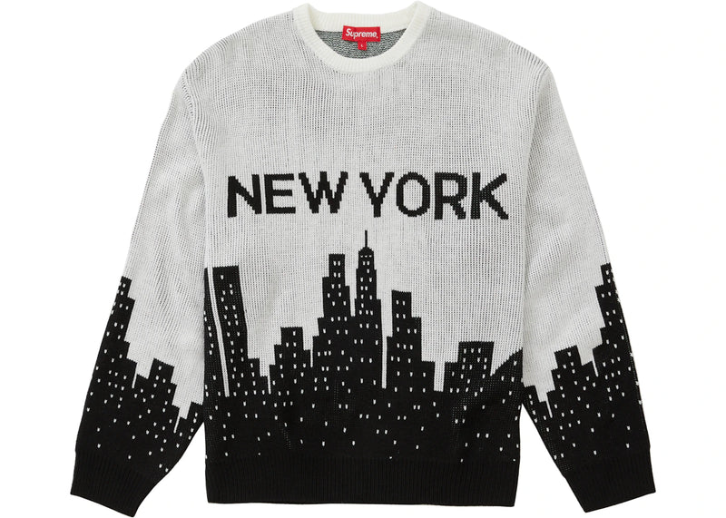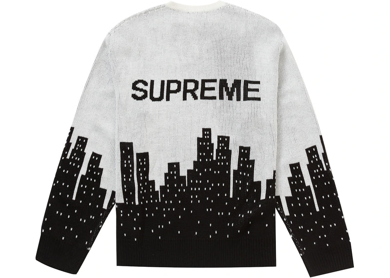 The Supreme Futura Sweater Black is a 100% cotton knit long-sleeve crewneck with a black base and white text print. The wraparound design spans the chest, back, sleeves, and cuffs,...