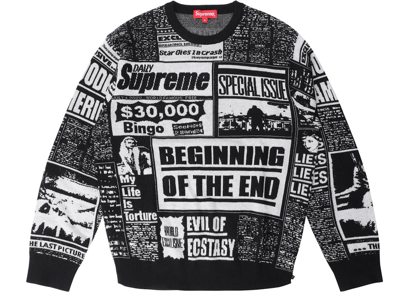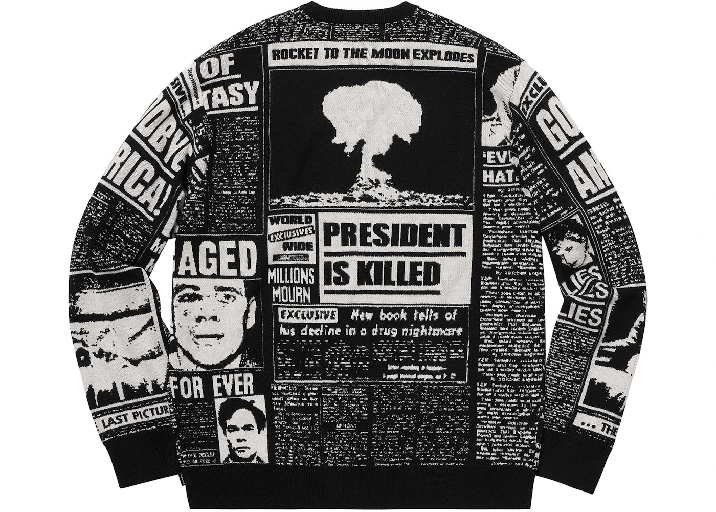 The Supreme Newsprint Sweater Black is now available at Side Kicks!