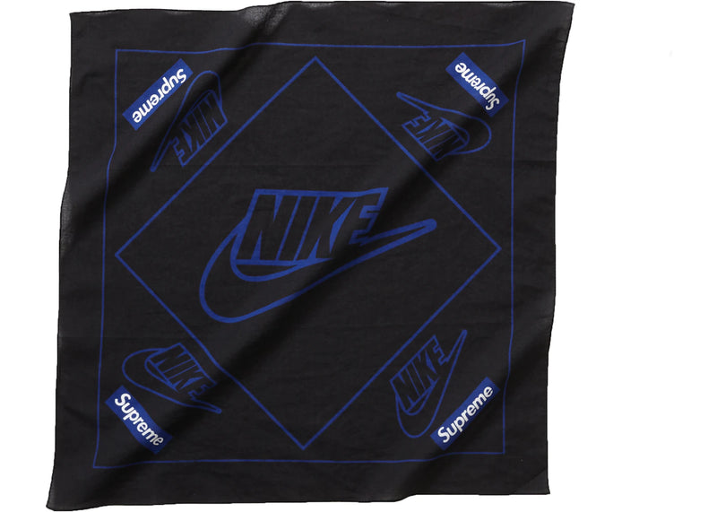 The Supreme Nike Bandana Black is a black woven cotton bandana with a printed graphic. The center features the Nike text and Swoosh logo in royal blue, framed by a...