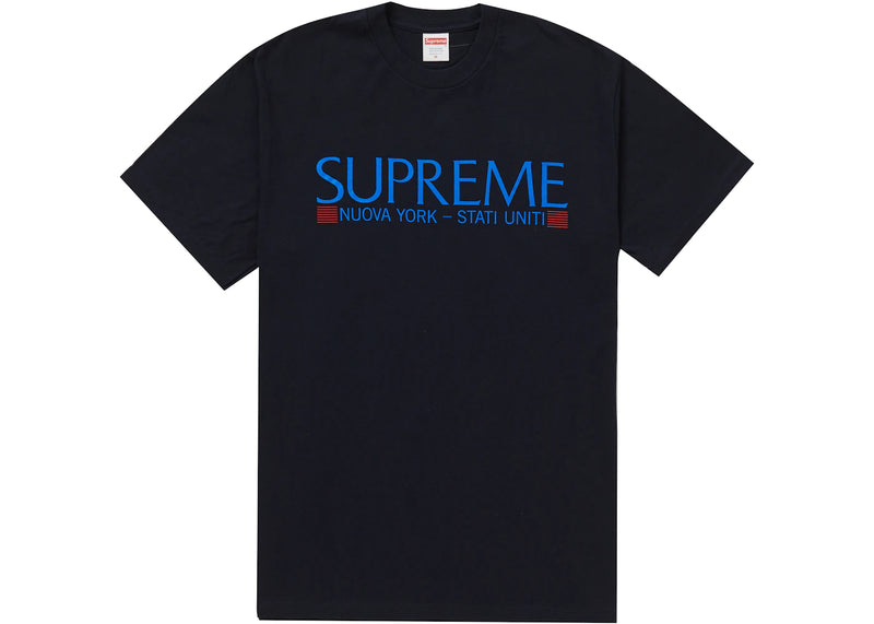 The Supreme Nuova York Tee Navy is now available at Side Kicks!