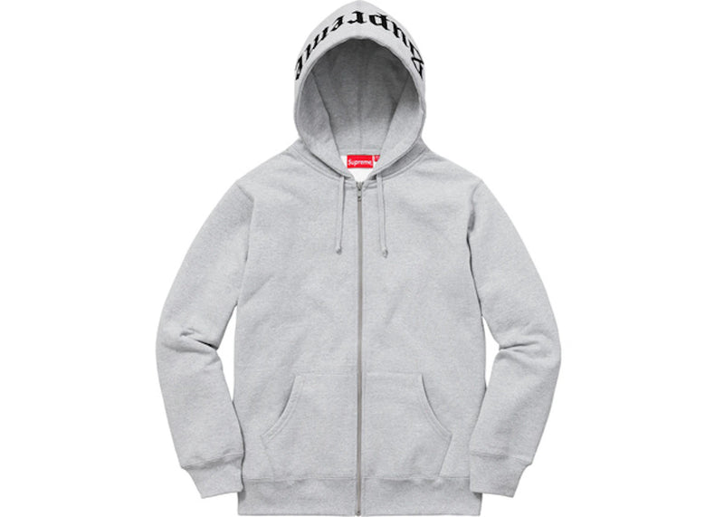 The Supreme Old English Hood Logo Zip Up Hoodie Heather Grey is now available at Side Kicks!