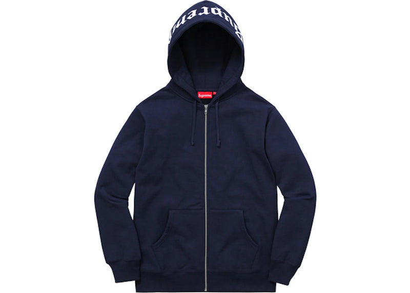 The Supreme Old English Hood Logo Zip Up Hoodie Navy is now available at Side Kicks!