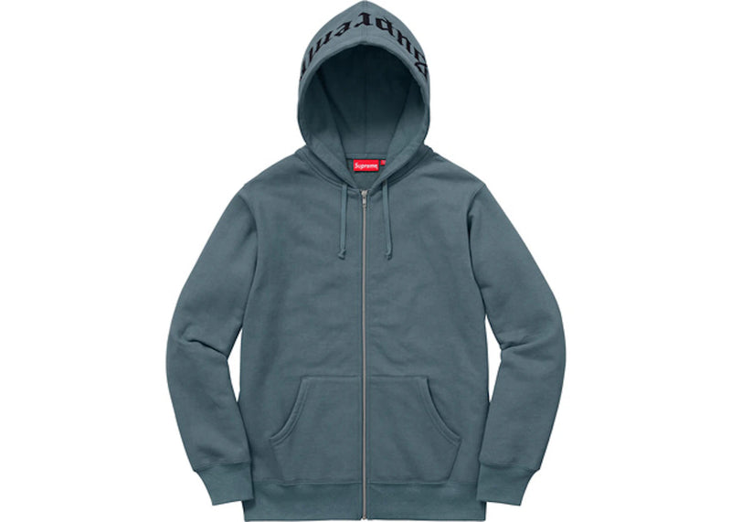The Supreme Old English Hood Logo Zip Up Hoodie Slate is now available at Side Kicks!