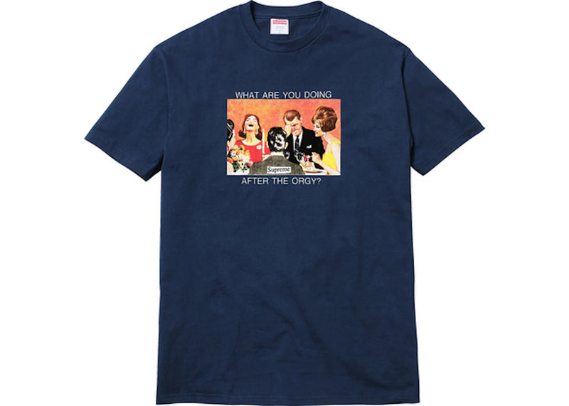 The Supreme Orgy Tee Navy is now available at Side Kicks!