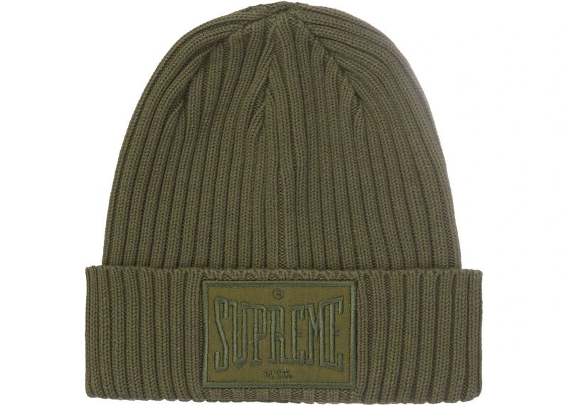The Supreme Overdyed Patch Beanie Olive is now available at Side Kicks!