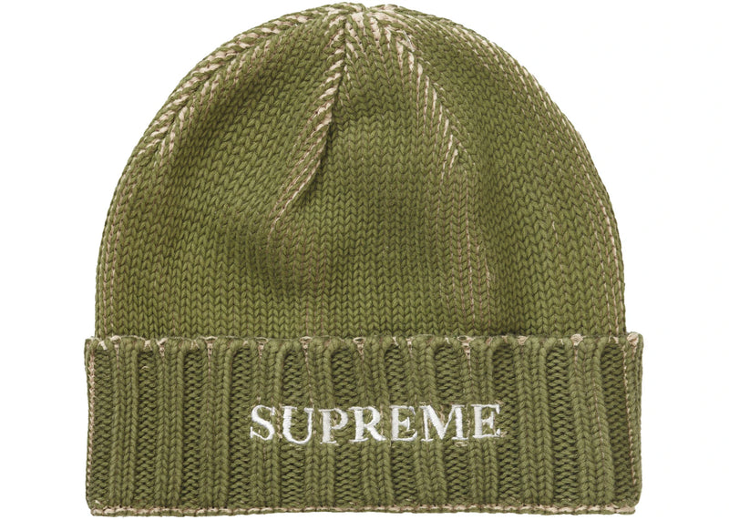 The Supreme Overprint Beanie Olive is now available at Side Kicks!