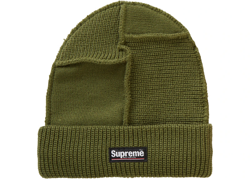 The Supreme Paneled Seam Beanie Olive is now available at Side Kicks!