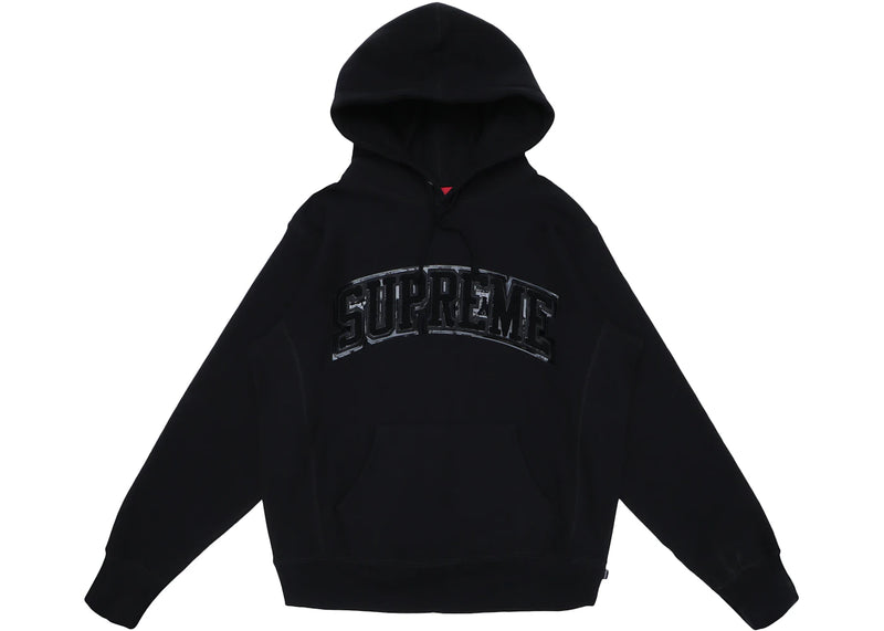 The Supreme Patent/Chenille Arc Logo Hooded Sweatshirt Black is now available at Side Kicks!
