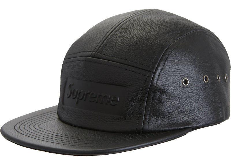 The Supreme Pebbled Leather Camp Cap Black is now available at Side Kicks!