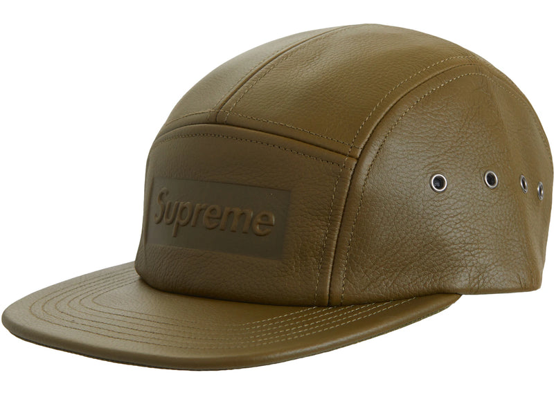 The Supreme Pebbled Leather Camp Cap Olive is now available at Side Kicks!