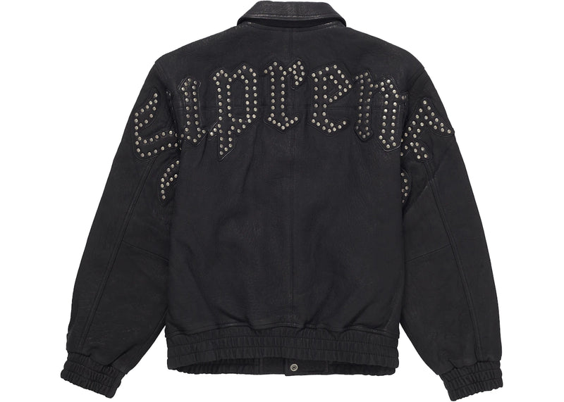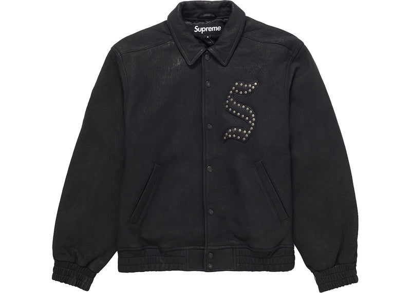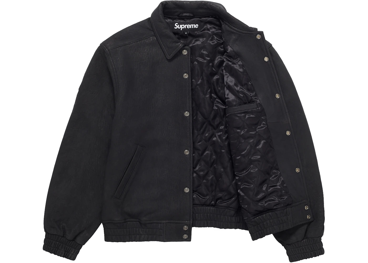 The Supreme Pebbled Leather Varsity Jacket Black is now available at Side Kicks!