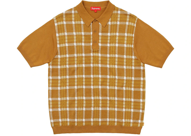 The Supreme Plaid Knit Polo Gold is now available at Side Kicks!