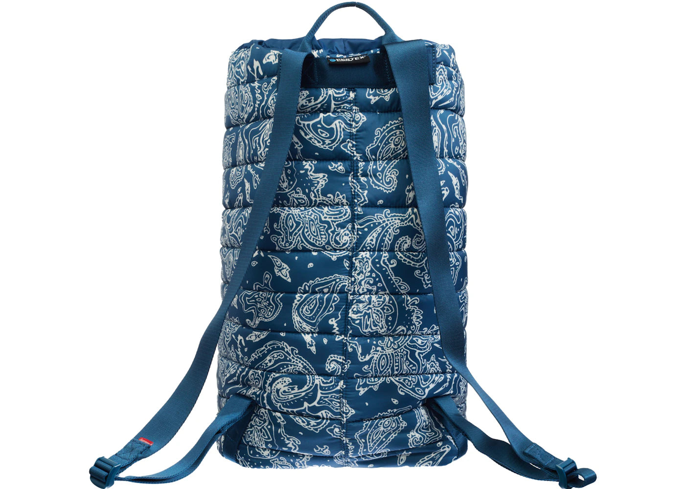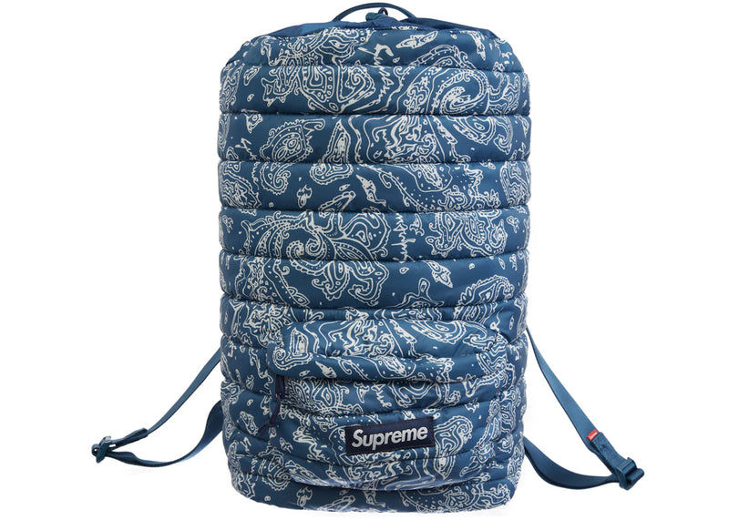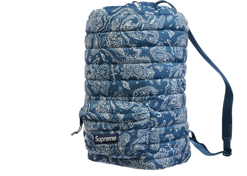 The Supreme Puffer Backpack Blue Paisley is now available at Side Kicks!