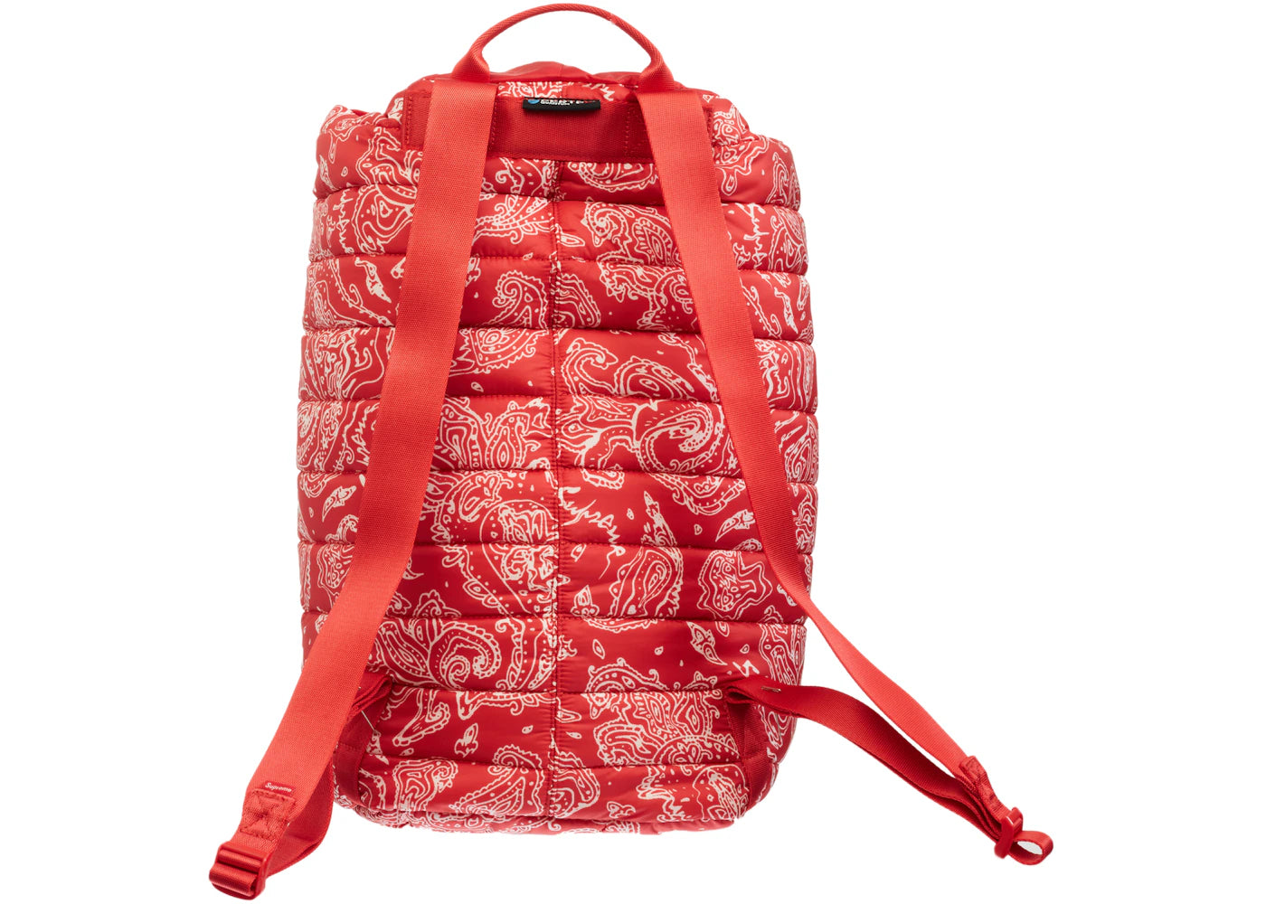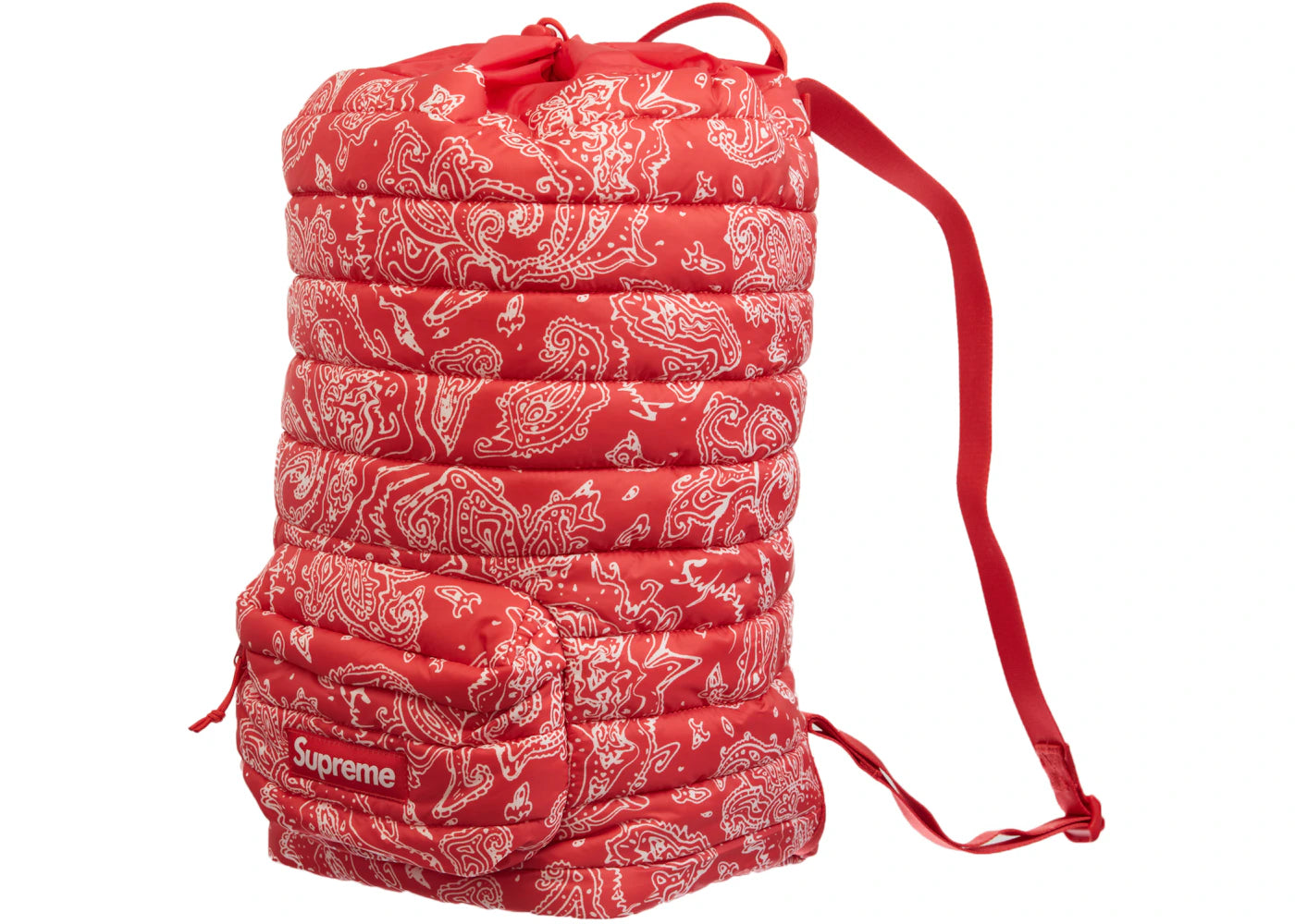 The Supreme Puffer Backpack Red Paisley is now available at Side Kicks!
