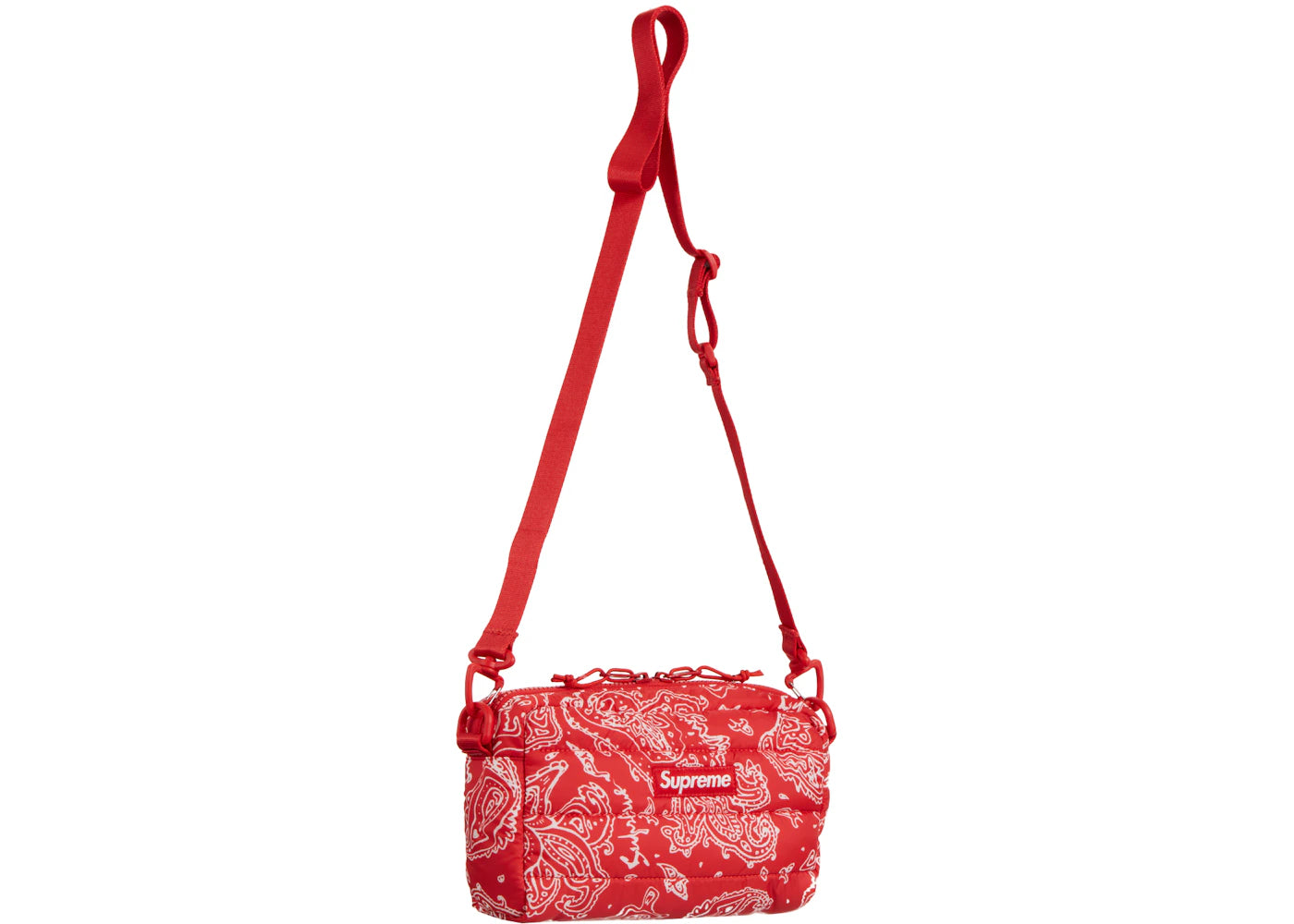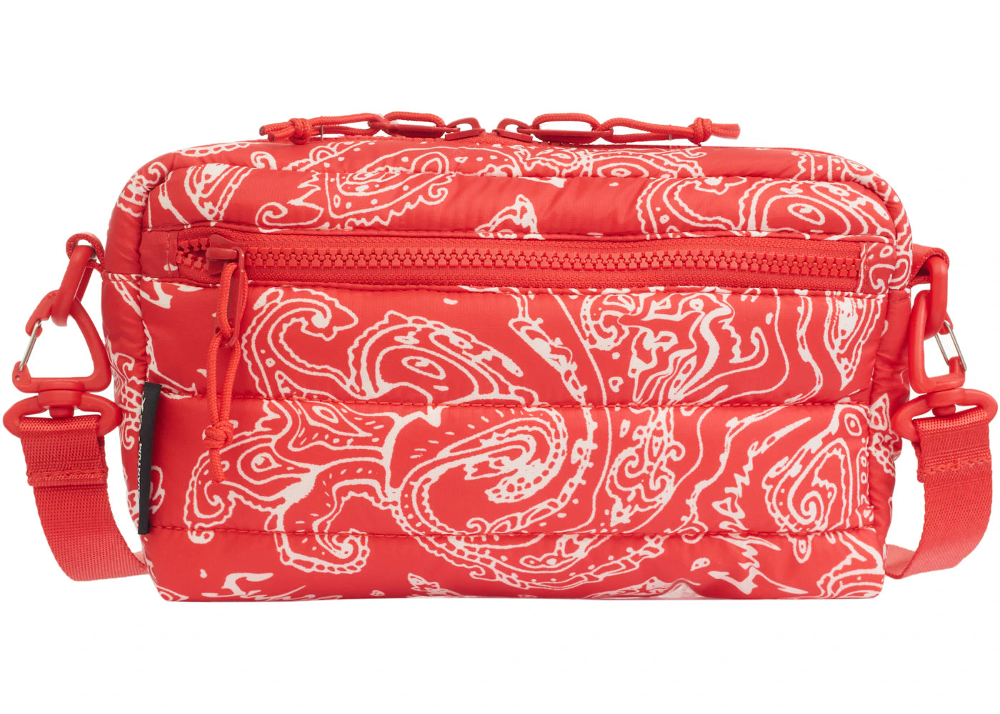 The Supreme Puffer Side Bag Red Paisley is now available at Side Kicks!