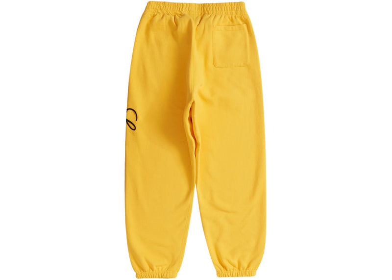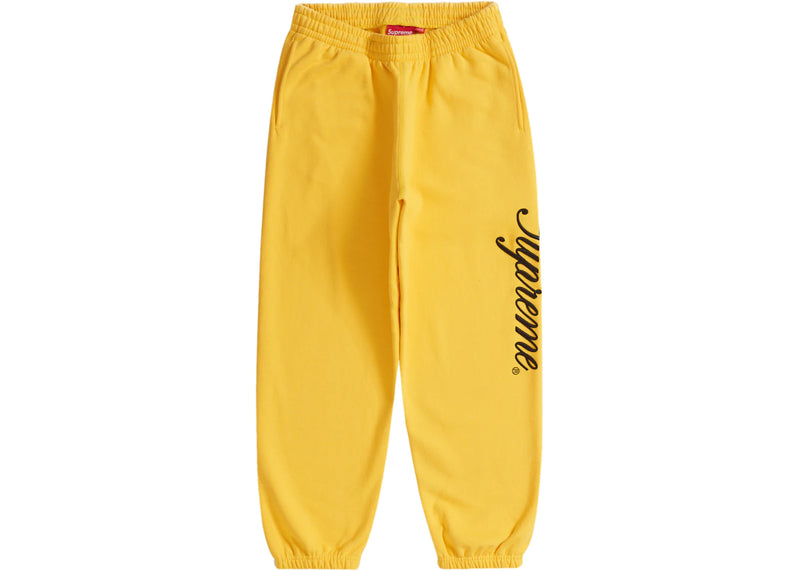 The Supreme Raised Script Sweatpant Yellow is now available at Side Kicks!