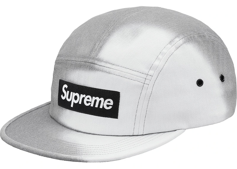 The Supreme Stone Island Reactive Ice Camo Ripstop Camp Cap Tan features a round badge with encrypted symbols on the front. Made from ripstop fabric, it includes an adjustable black strap for sizing. The tan colorway covers the entire cap. Released on May 12, 2022, the Supreme Stone Island Reactive Ice Camo Ripstop Camp Cap Tan is available now at Side Kicks.
