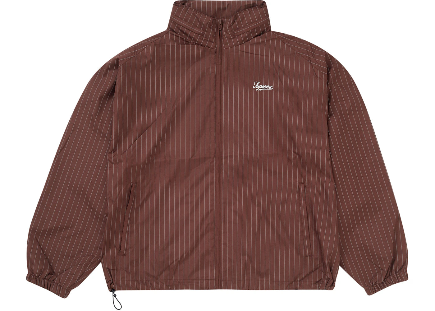 The Supreme Reflective Pinstripe Track Jacket Brown is now available at Side Kicks!