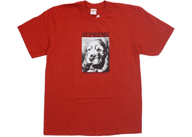 The Supreme Remember Tee Heather Grey is a short-sleeve cotton jersey t-shirt in heather grey. It features a screen-printed black and white image of a cocker spaniel with "Remember your friends" text below. The Supreme logo appears above the image in black serif caps, with a red box logo on the collar tag.