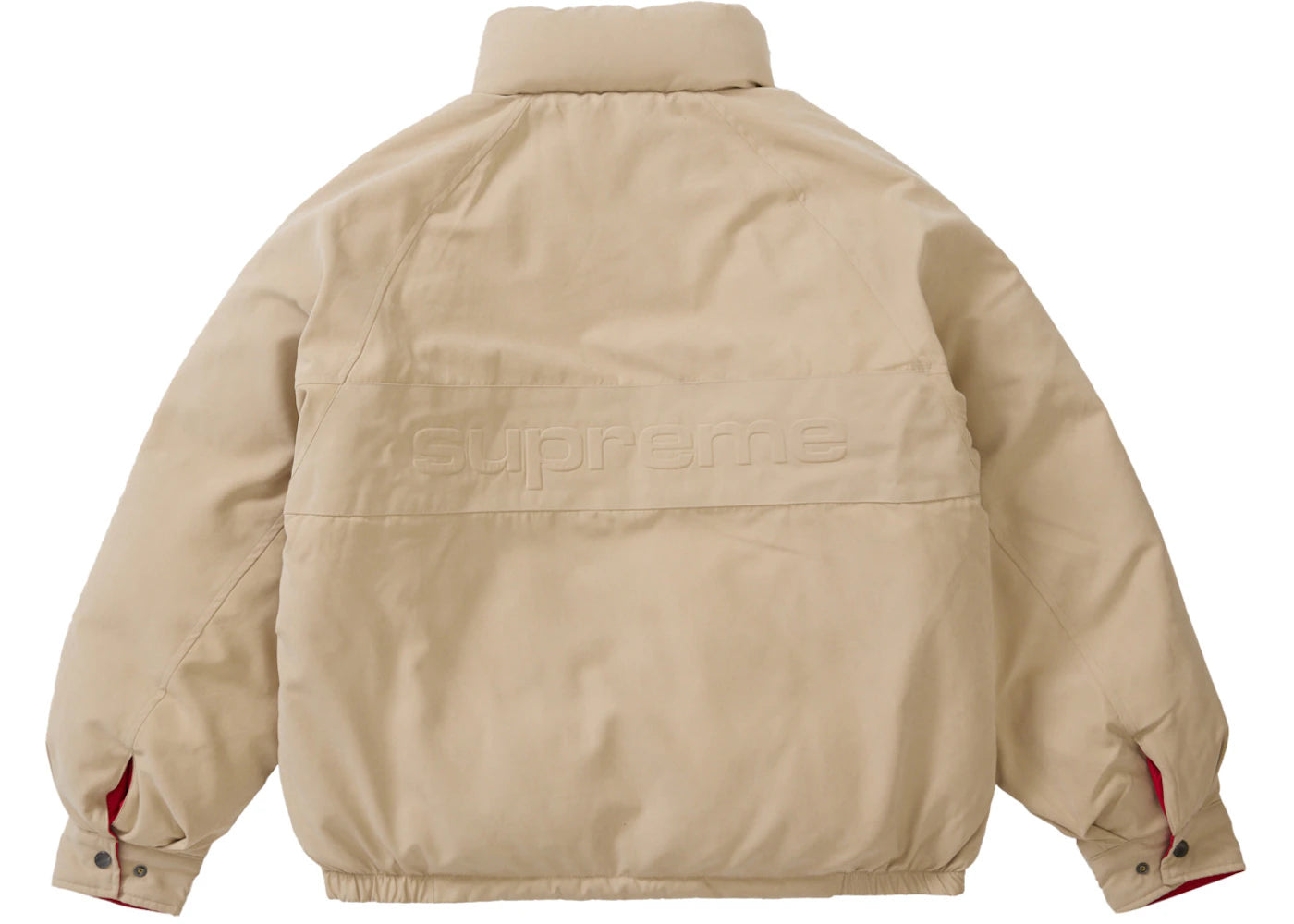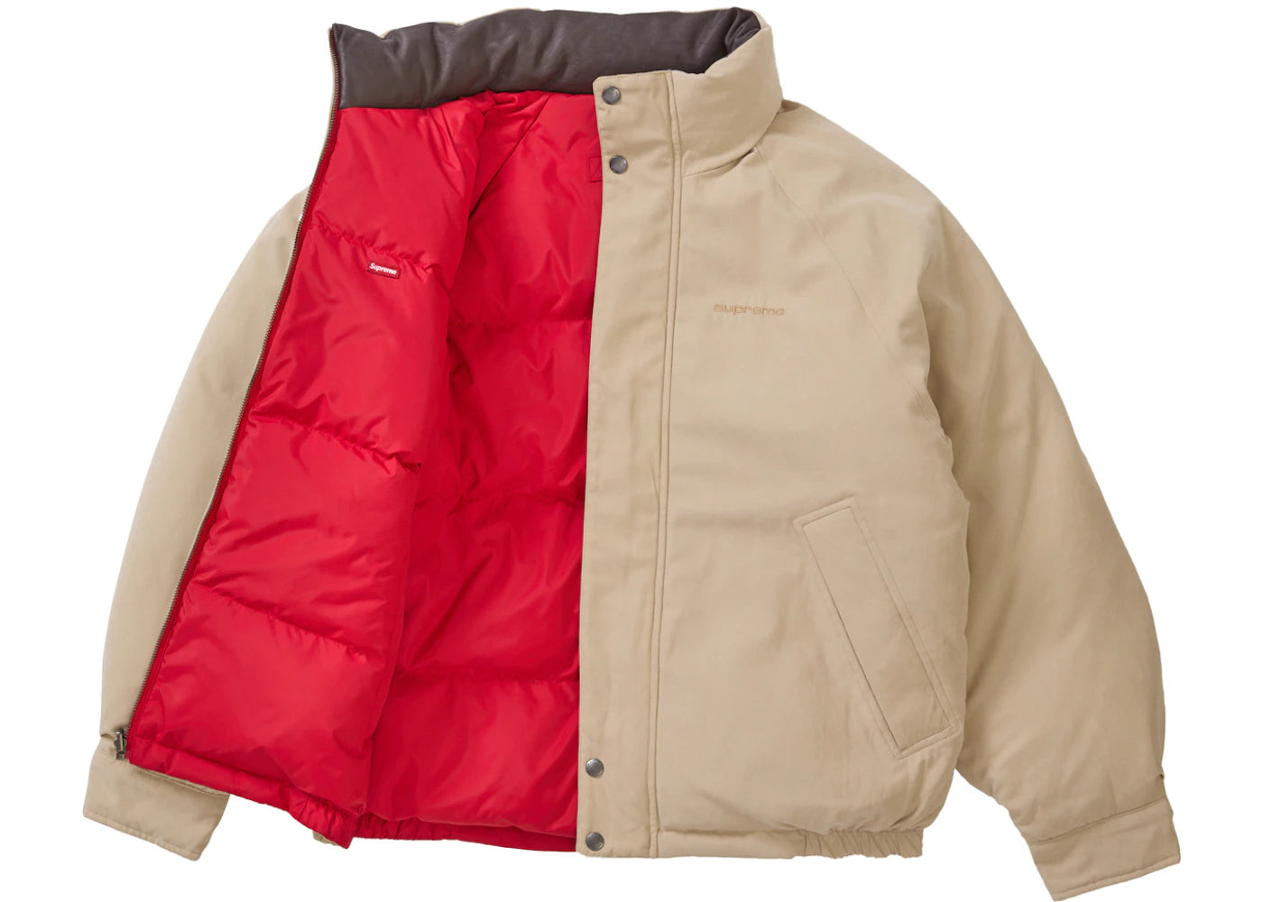 The Supreme Reversible Down Puffer Jacket Tan is now available at Side Kicks!