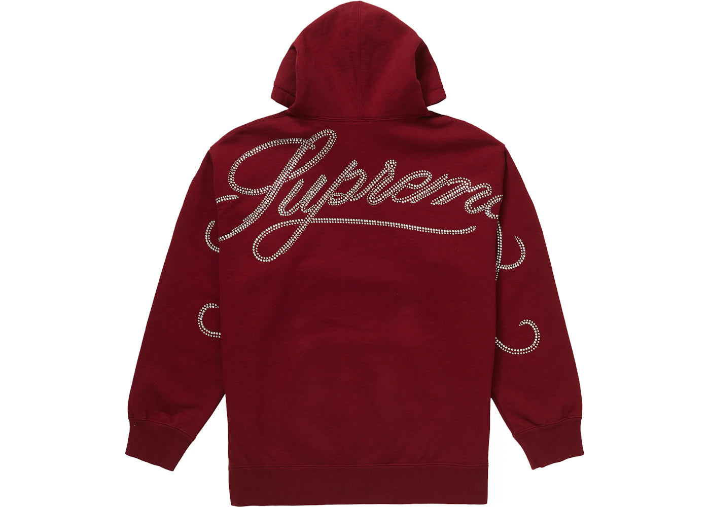 The Supreme Rhinestone Script Hooded Sweatshirt Cardinal is now available at Side Kicks!