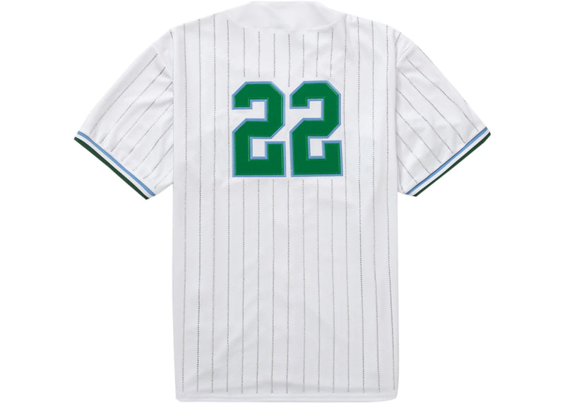The Supreme Rhinestone Stripe Baseball Jersey White is now available at Side Kicks!