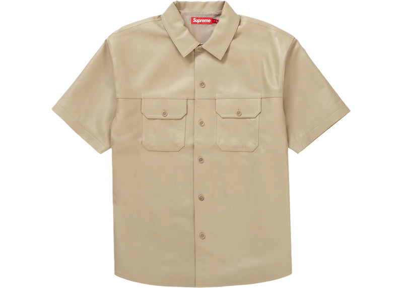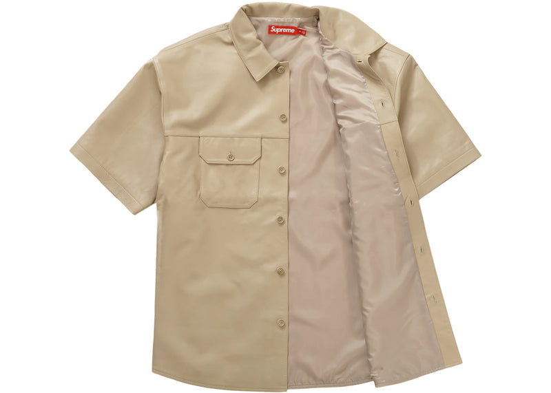 The Supreme S/S Leather Work Shirt Tan is now available at Side Kicks!