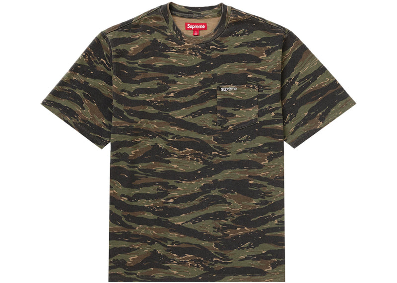 The Supreme S/S Pocket Tee (SS24) Tiger Camo is now available at Side Kicks!