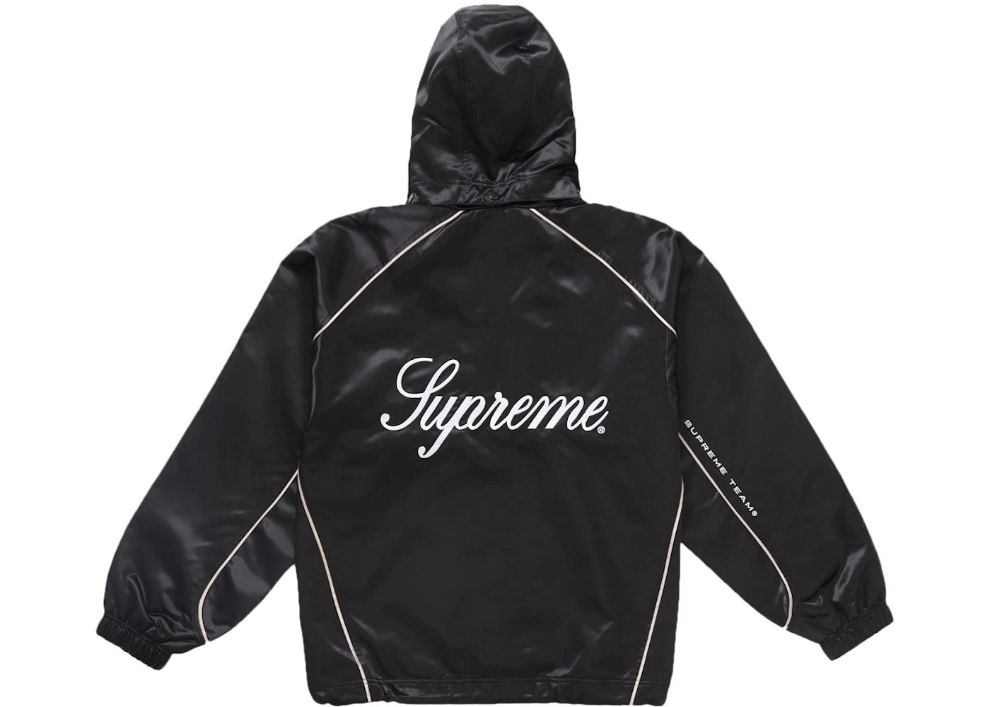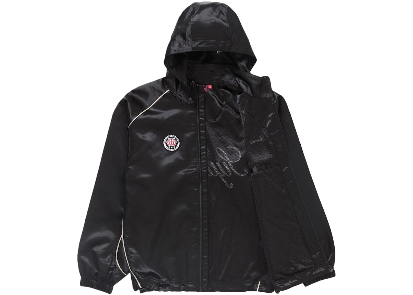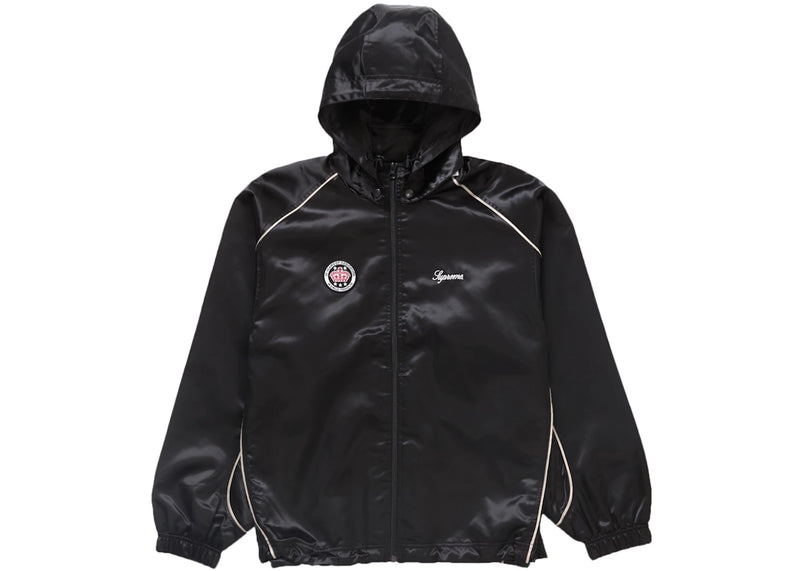The Supreme Satin Hooded Track Jacket Black is now available at Side Kicks!