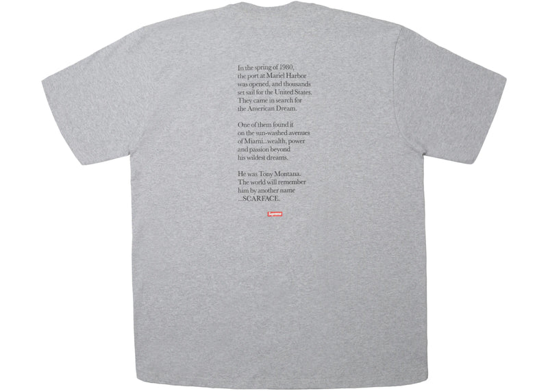 The Supreme Scarface Shower Tee Heather Grey is now available at Side Kicks!