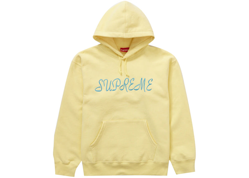 The Supreme Script Hooded Sweatshirt Light Yellow is now available at Side Kicks!