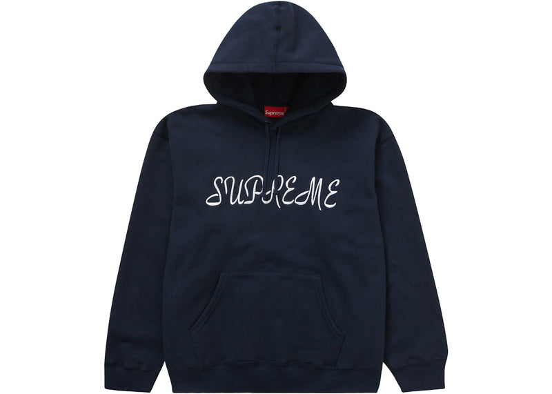 The Supreme Script Hooded Sweatshirt Navy is now available at Side Kicks!