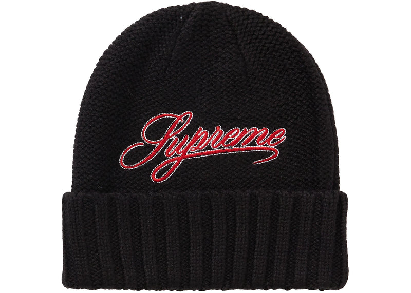 The Supreme New Era Script Beanie Black features a stretchy acrylic construction with a cuffed design. The front displays Supreme branding in large white cursive stitching, while New Era embroidery...