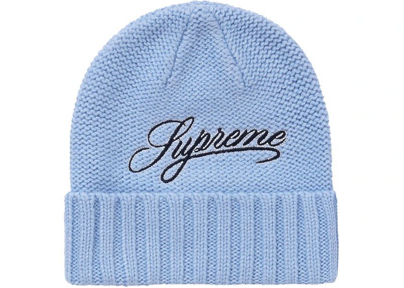 The Supreme Script Logo Beanie Light Blue is now available at Side Kicks!