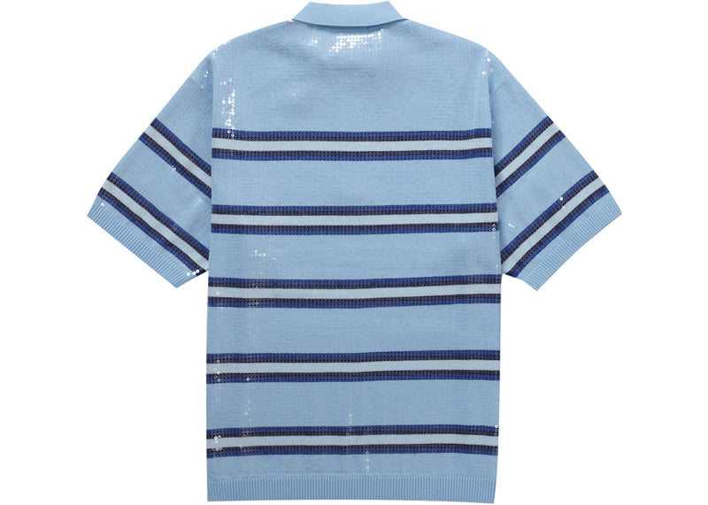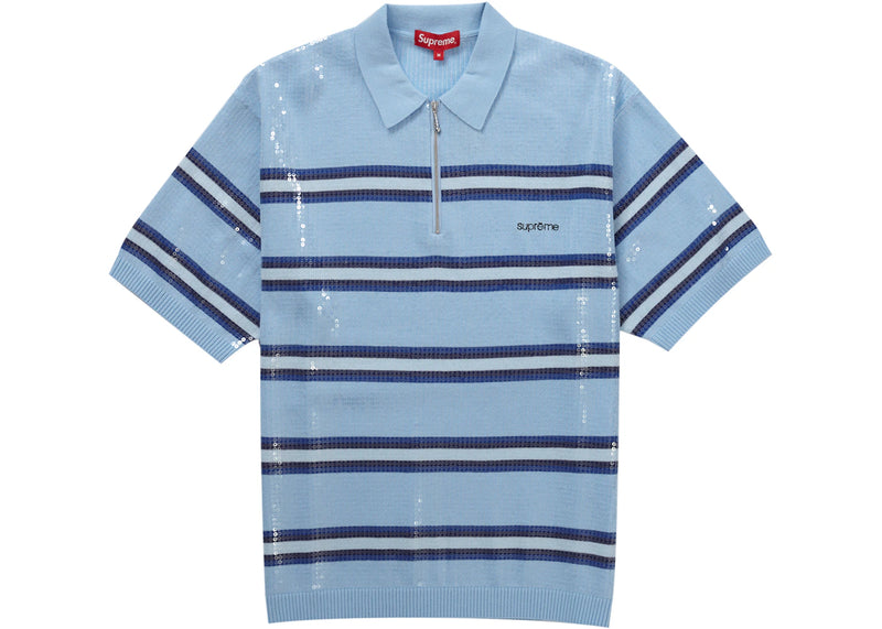 The Supreme Sequin Stripe Zip Polo Blue is now available at Side Kicks!