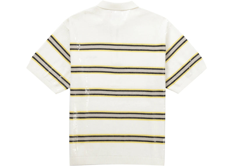 The Supreme Sequin Stripe Zip Polo White is now available at Side Kicks!