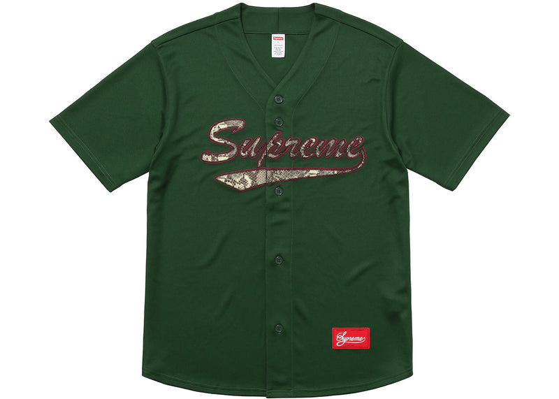 The Supreme Snake Script Logo Baseball Jersey Dark Green is now available at Side Kicks!