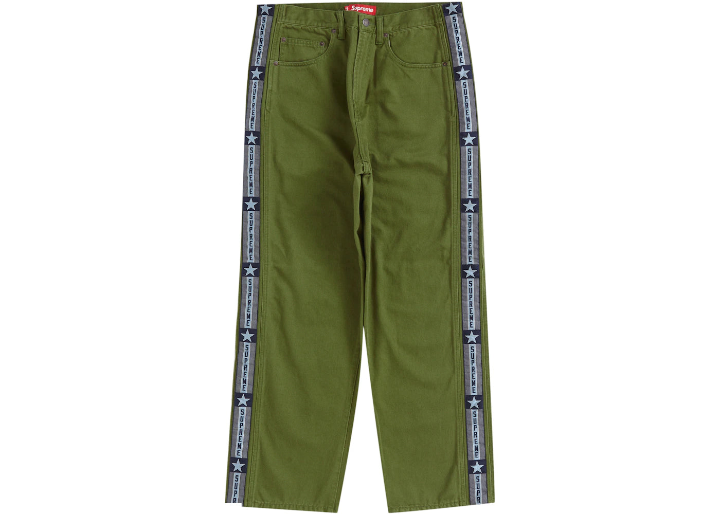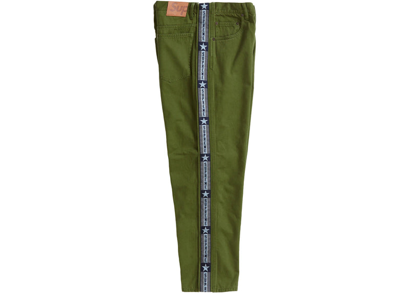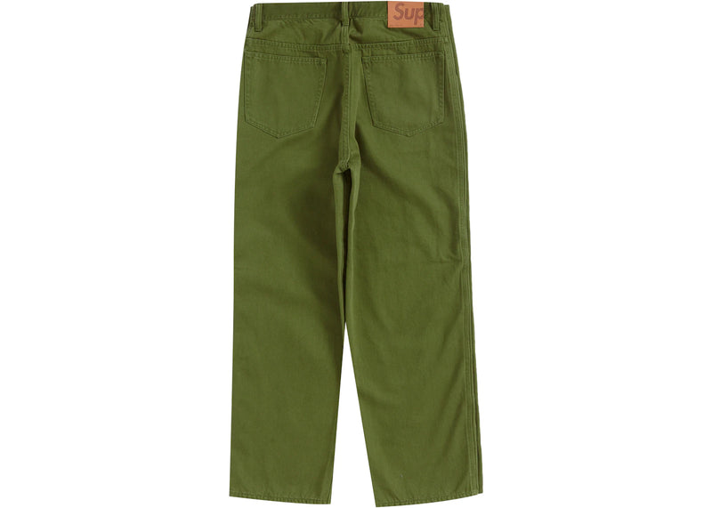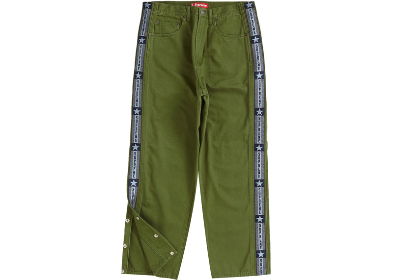 The Supreme Snap-Off Baggy Jean Olive is now available at Side Kicks!