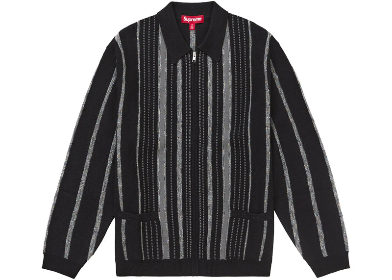 The Supreme Speckle Stripe Zip Up Cardigan Black is now available at Side Kicks!